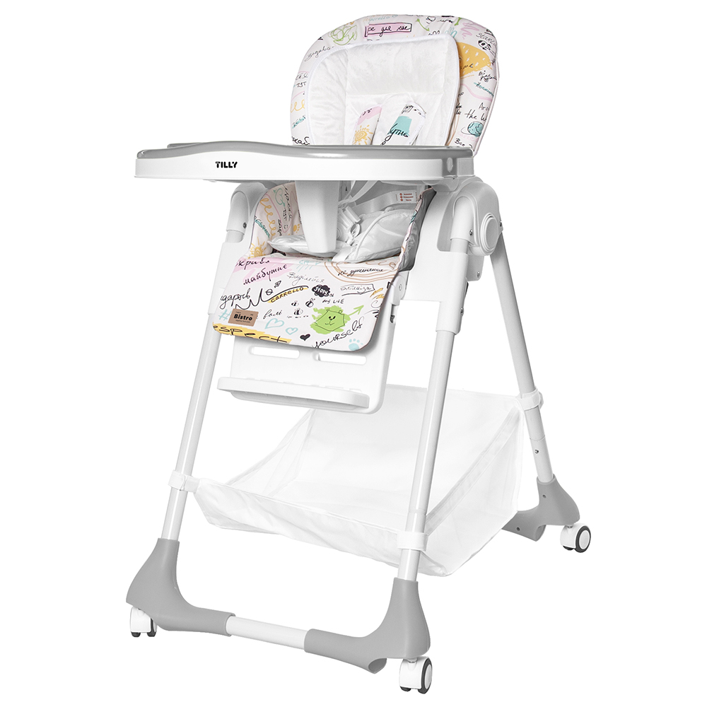 Высокий классический стульчик для кормления TILLY Bistro T-641/2 порадует своей функциональностью и простотой в использовании. Пользуясь TILLY Bistro T-641/2, вы облегчите процесс кормления малыша, а также сможете его развлечь, пока будете заняты своими делами. Продуманные регулировки позволяют подобрать оптимальное положение для возраста ребенка, а установленные пятиточечные ремни и разделитель между ножек гарантируют его безопасность. К тому же вы всегда сможете снять столешницу с подносом и пододвинуть стульчик к общему столу, чтобы малыш почувствовал себя взрослым. Ну а подвесная корзина для мелочей в TILLY Bistro T-641/2 станет хорошим дополнением к нему.